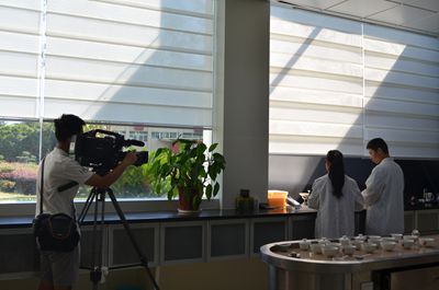 4日摄制组一行在我司九龙山有机茶园时拍摄期间对高枞茶园,及有机茶的具体内容做了简要的描述和解说。随后,一行人来到公司,在审评室里跟随审评师的手法和步骤,拍摄了武夷岩茶审评方法和流程。在公司展厅何董亲切接待了林老师一行拍摄团队,并一同品饮今年春茶小品种,欣赏了浪漫音乐红茶茶艺表演及大红袍茶艺表演。