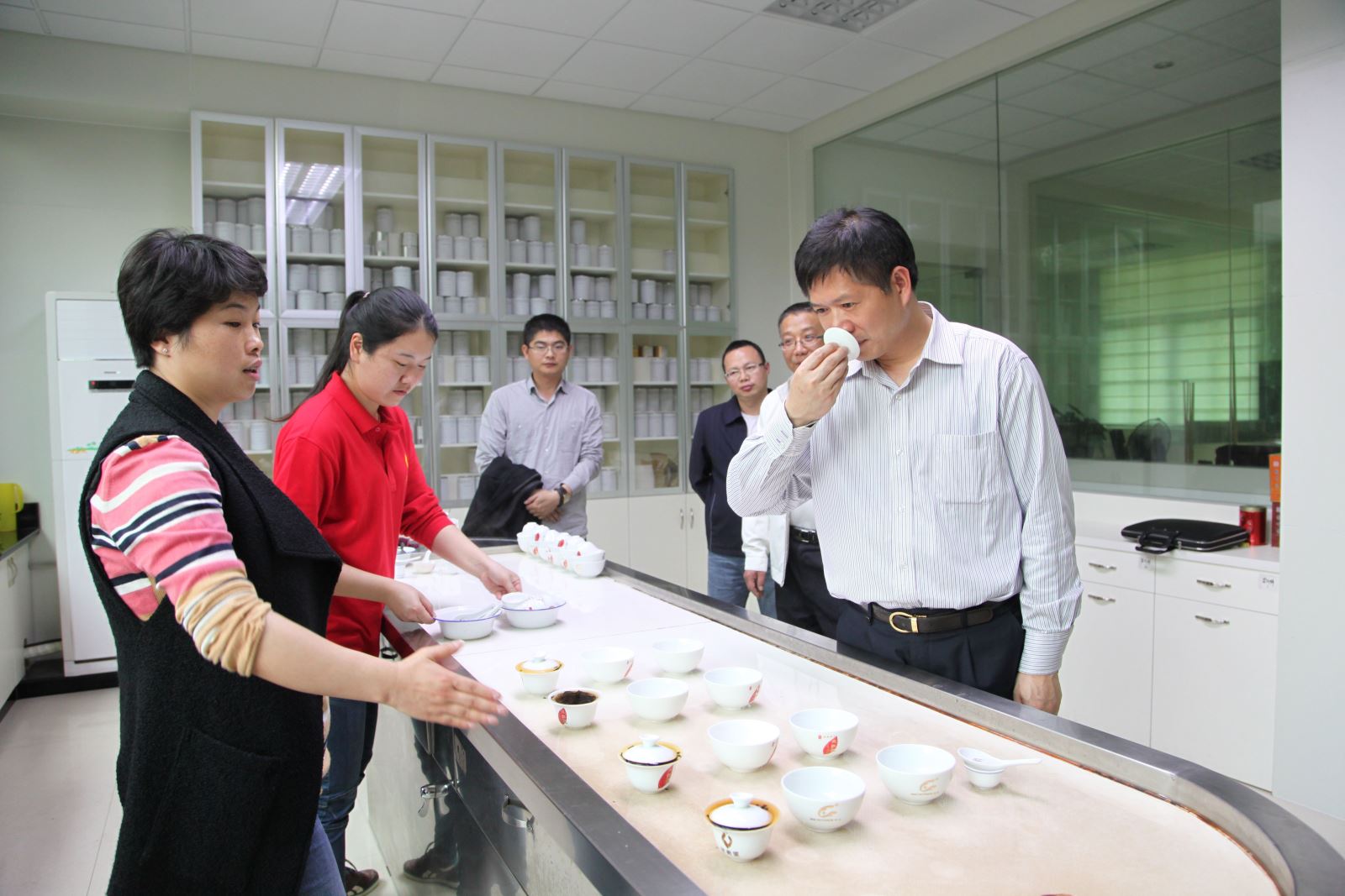 在武夷星质管部内,一行人先后了解了质管部的规模及构成。并一同在审评室内以标准审评的方式尝试了不同火工香型的岩茶对比。张厅长对民营企业用最先进的理念和最先进的技术对待农业科学研究与茶产业发展事业的做法表示肯定。